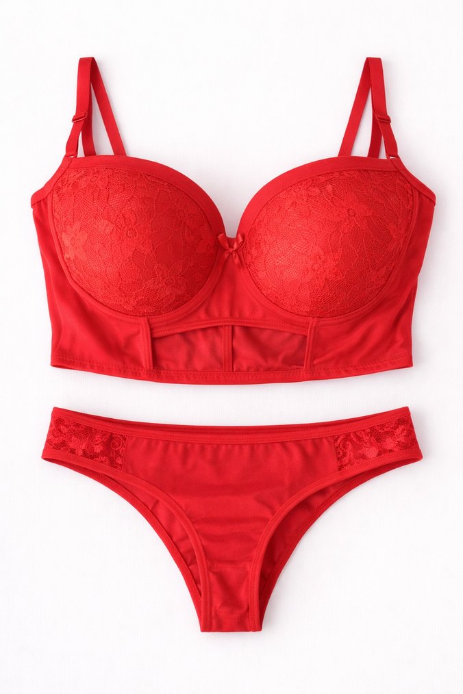 Kırmızı renkte, dantel detaylı midi uzunlukta sütyen ve külot takımı. Ayarlanabilir askılarıyla rahat kullanım sağlar. ❤️