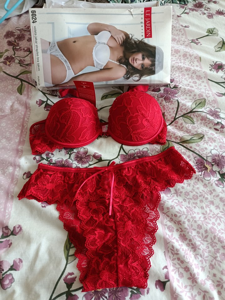 Kırmızı dantelli sütyen ve mini külot, rahat bohem tarzıyla baskılı dantel deseni içerir. Kısa boy tasarımıyla canlı ve zarif bir görünüm sunar. ❤️