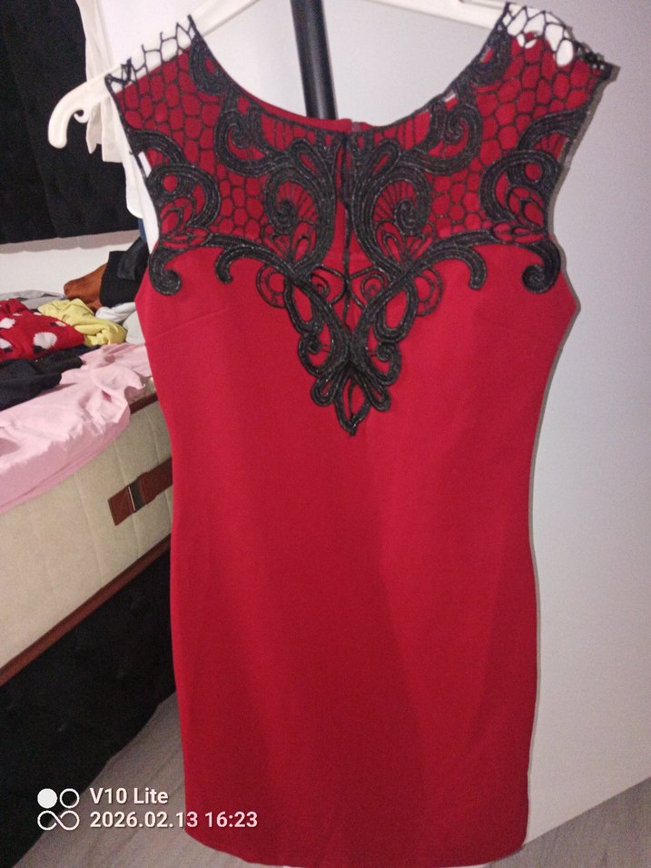 Kırmızı ve siyah dantel işlemeli V yaka, kolsuz ve vücuda oturan midi elbise, gotik tarzda cesur bir şıklık sunar.