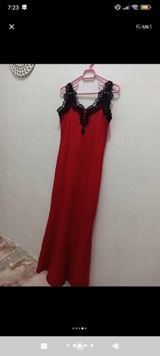 Kırmızı Dantelli V Yaka Uzun balık Elbise