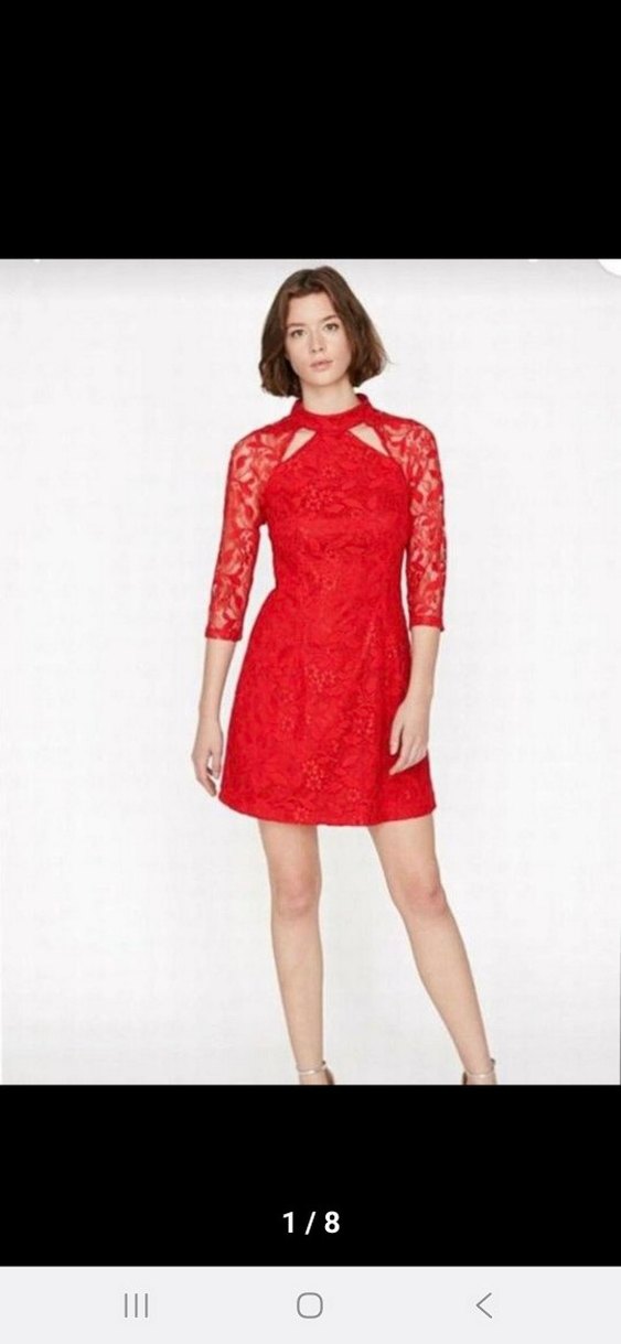Kırmızı dantel kumaştan, yüksek yakalı ve askılı kollu, vücuda oturan kesime sahip mini elbise. Cesur ve çağdaş bir tarz sunar. Romantik akşamlar için uygun. ❤️12 yasa kadar da olur