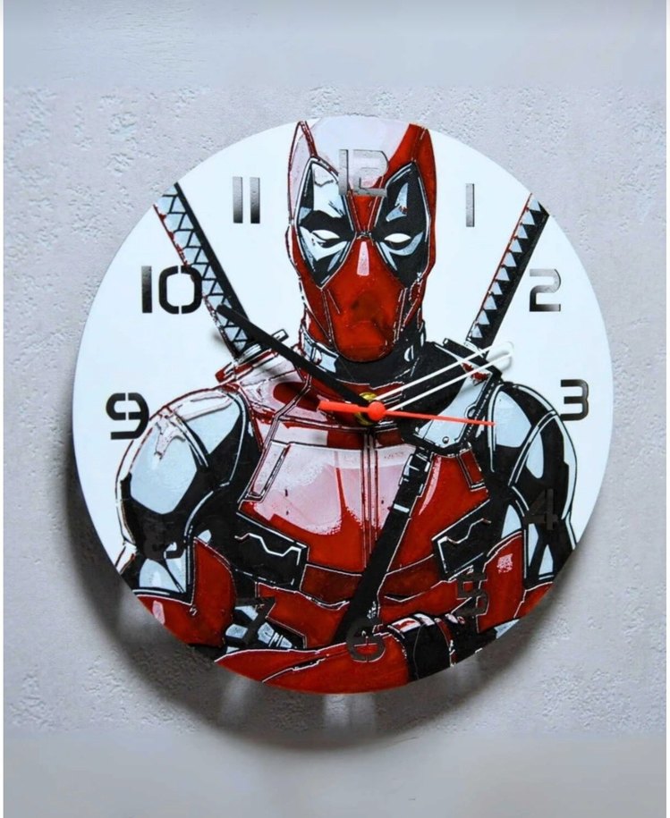Koyu kırmızı Deadpool figürlü duvar saati, net rakam işaretleriyle işlevsel ve dikkat çekici bir dekor ürünüdür.