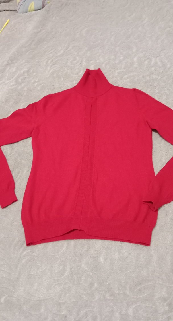 Yarım balıkçı yaka, uzun kollu, yırtmaçlı kırmızı kadın kazak. Yumuşak ve sıcak kan, günlük kullanıma uygun.
