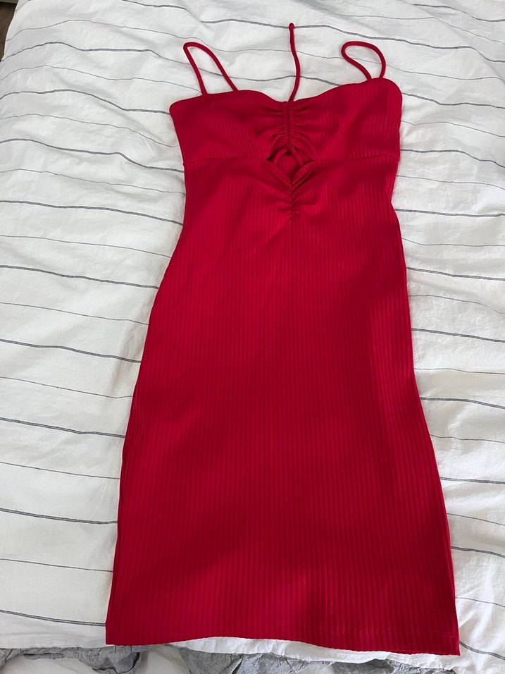 Kırmızı, dekolteli ve ince askılı bu mini elbise, şerit detaylara sahip. Parlak sentetik kumaşı cesur bir hava katıyor.