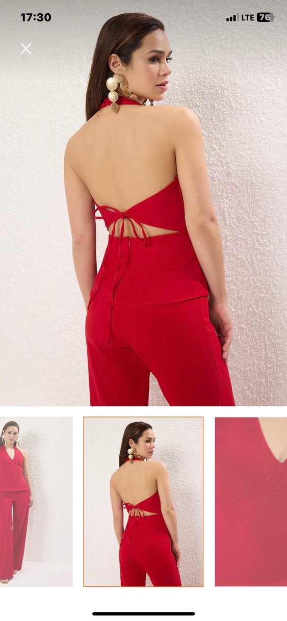 Bu kırmızı tulum, halter yaka ve ince askılarla tasarlanmıştır. kumaştan olup, sırt detayı ve parlak görünümüyle parti ve resmî günler için uygundur.