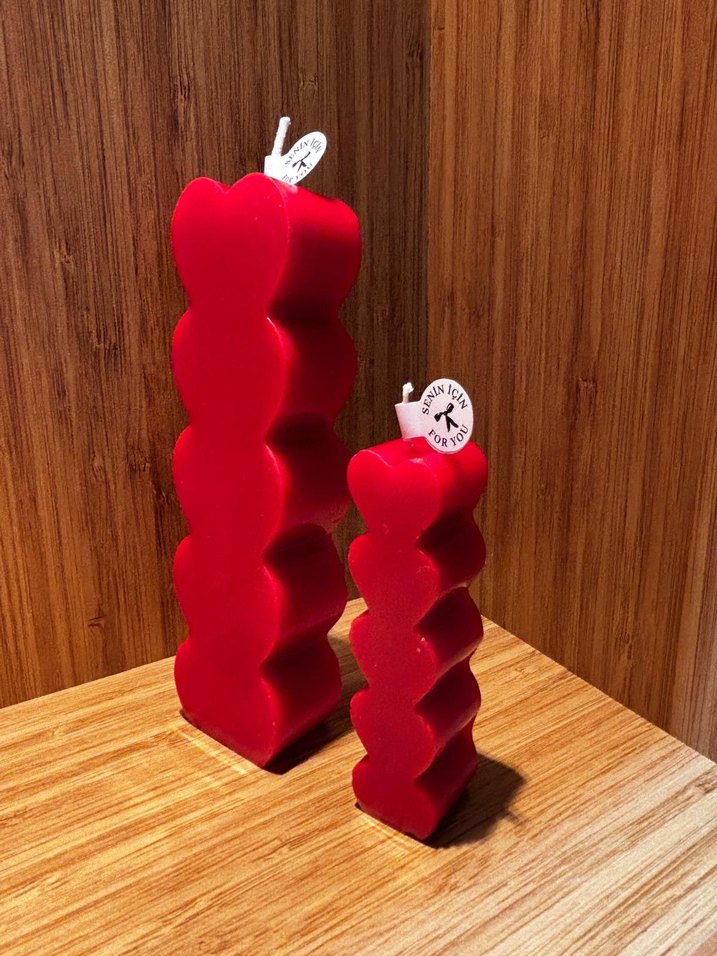 İki farklı boyda, dalgalı şekilli kırmızı dekoratif mumlar. Ortama renkli bir dokunuş katar. ️ İkili fiyattır