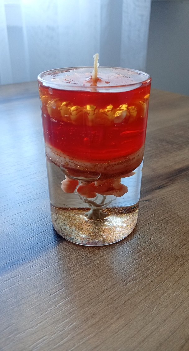 İçinde dekoratif unsurlar bulunan, katmanlı ve sanatsal görünümlü kırmızı jel mum. ️