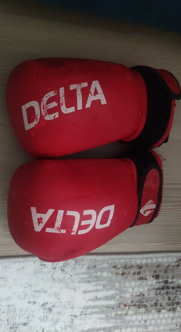 Yumuşak ve sıcak kumaş yüzeyli, 'DELTA' baskılı kırmızı erkek boks eldiveni, Velcro kapamalı, athleisure tarzda.