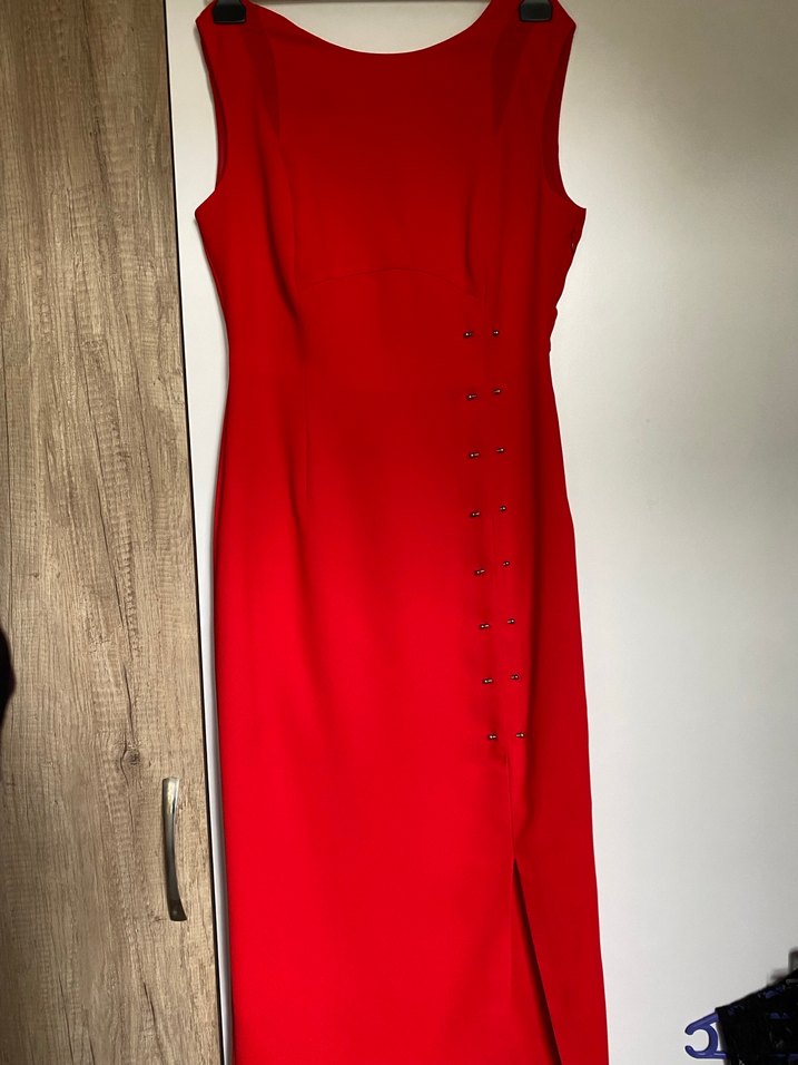 Kırmızı, düğmeli, kolsuz, uzun abiye elbise, yakasında kesik yakalı detay ve yan düğmeler bulunur. Parlak kumaşıyla modern klasik tarzda