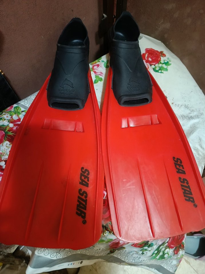 Kırmızı renkte, kaymaz tabanlı, Velcro kapamalı erkek deniz ayakkabısı. "SEA STAR" baskılı, plajda kullanıma uygun renkli tasarım.