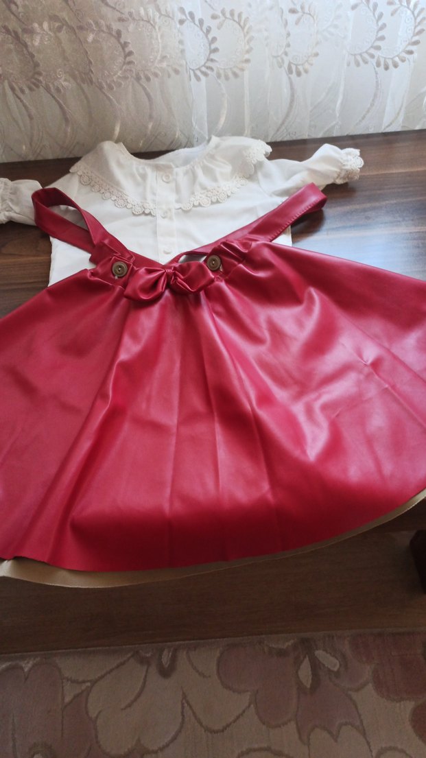 Kırmızı Deri Askılı Kız Çocuk Elbisesi ve beyaz gömlek