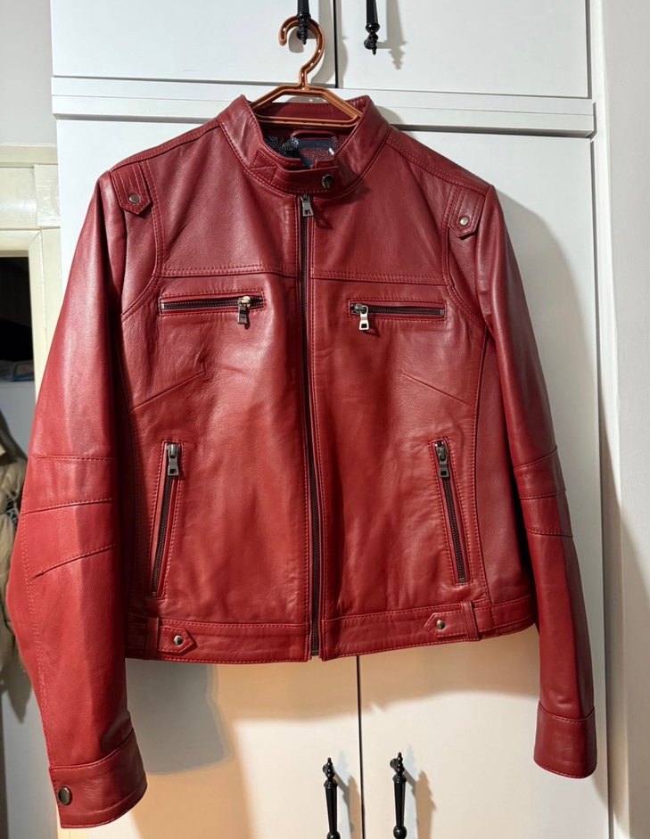 Kırmızı deri biker ceket, normal kesim, yakası kesimli ve uzun kolludur. Fermuarlı cepleri ve ön fermuarı vardır.