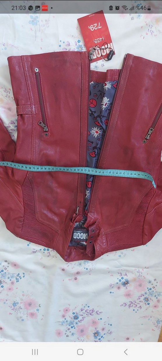 Kırmızı deri, fermuarlı cepli ve kesimli yakalı, dar kesim biker ceket. Askılı kollu ve midi boyda, günlük kullanım için uygun grunge punk tarzı.