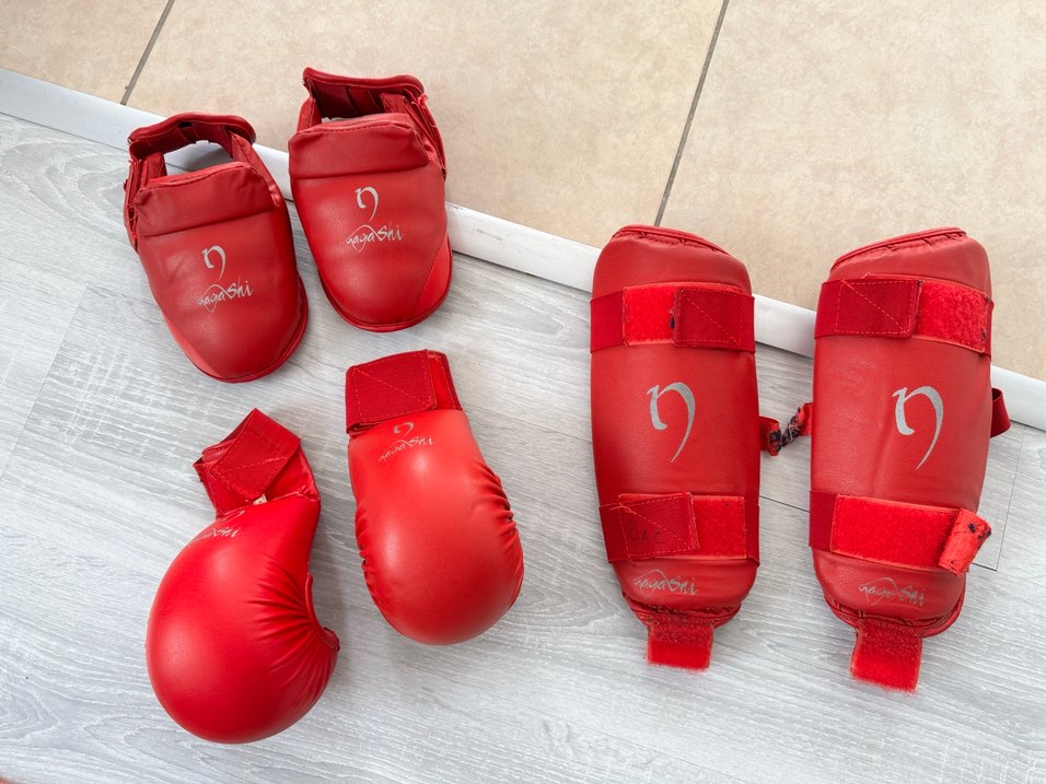 Kırmızı deri karate ellik ayaklık kaval kpruyucu, Velcro bantlı ve athleisure tarzında, konvansiyonel kullanıma uygun, desensiz ve dayanıklı.