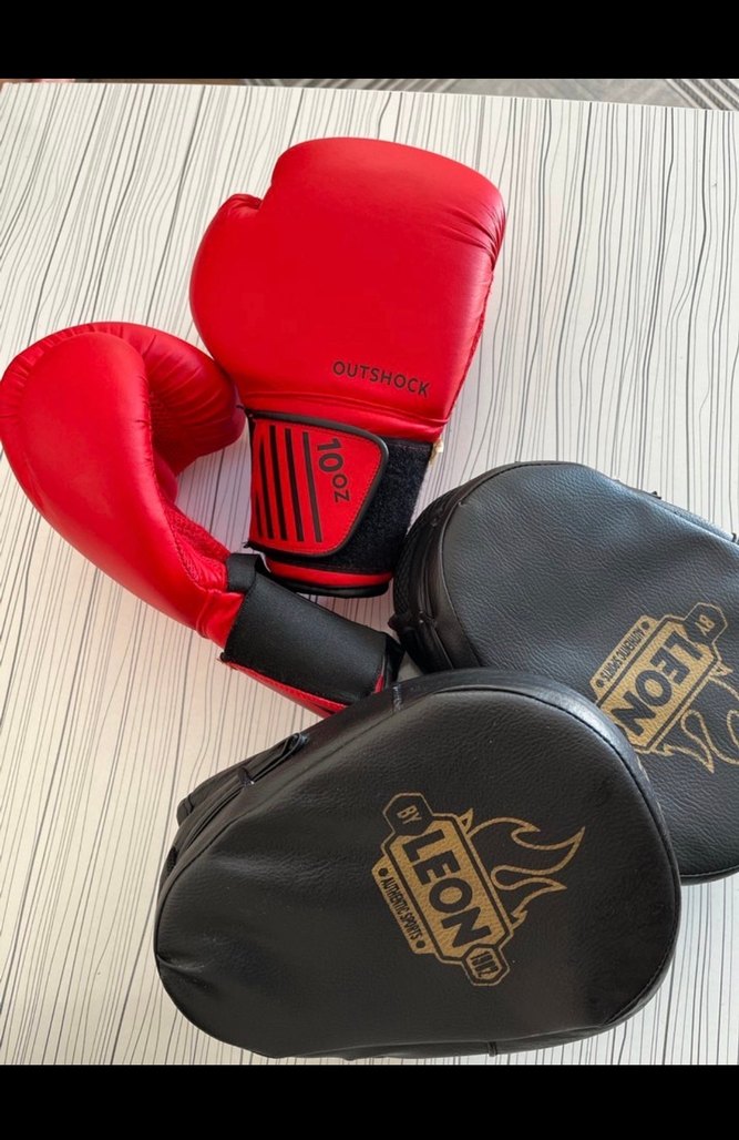 Renkli baskılı detaylara sahip kırmızı deri erkek boks eldiveni, Velcro kapatma ile güvenli kullanım sağlar. LEON siyah antrenman pedleri ile birlikte.