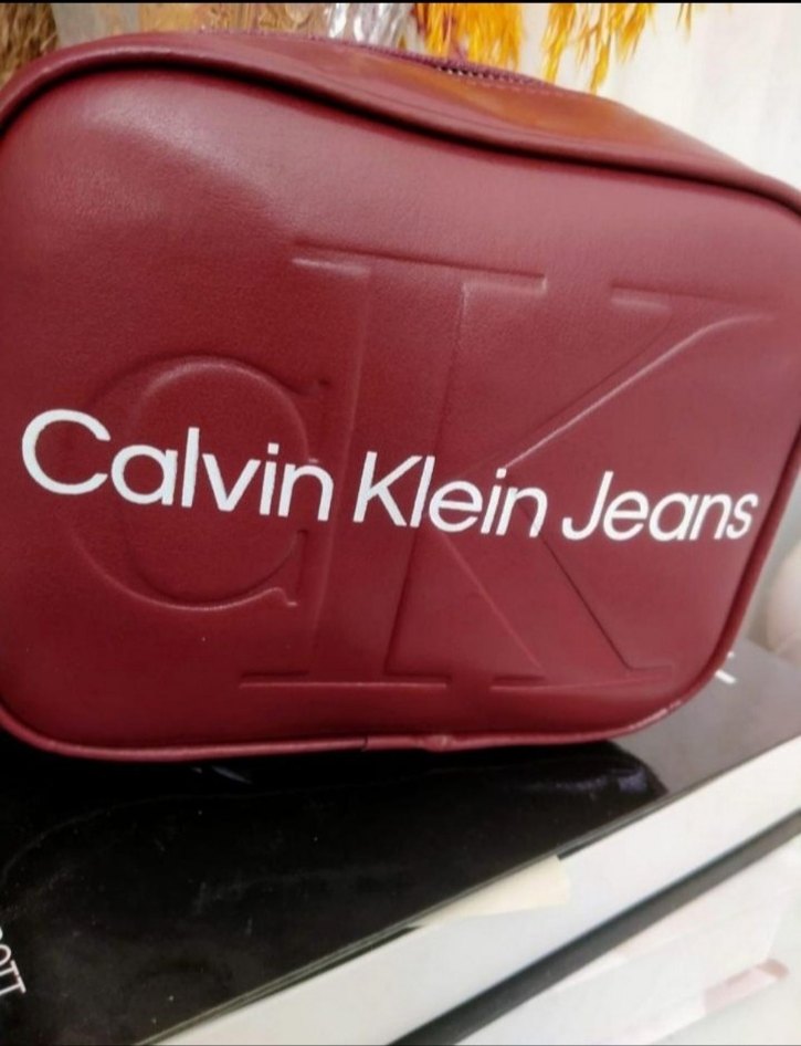 Calvin Klein Jeans markalı, baskılı logo ve tokalı detaylı kırmızı deri çapraz çanta, rahat ve şık sokak stili için uygun.