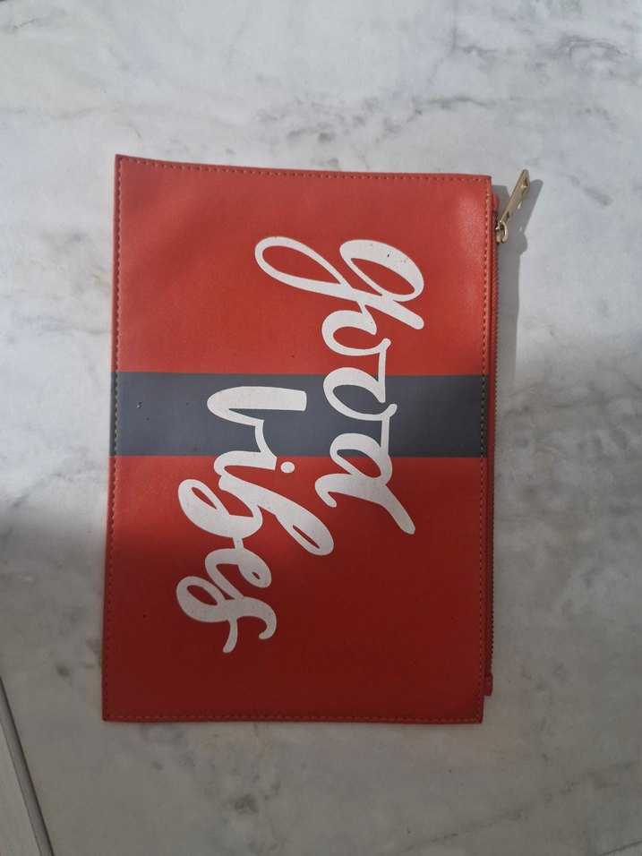 Kırmızı deri clutch çanta, parlak yüzey ve cesur baskılı tasarıma sahiptir. Fermuarlı kapanışıyla günlük kullanım için uygundur.