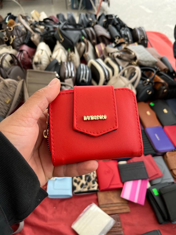 Kırmızı deri, fermuarlı kadın cüzdan. Minimalist baskılı tasarımıyla günlük sokak stiline uygun, renkli ve trend görünümlü.