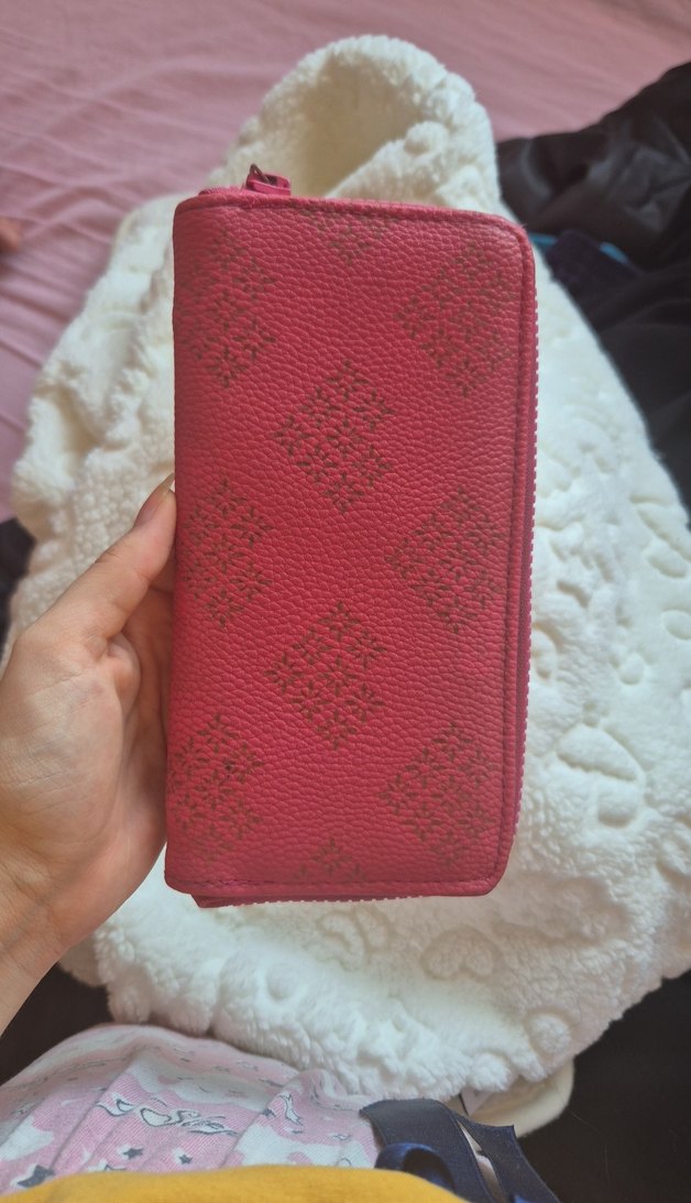Kırmızı deri kadın cüzdanı, fermuarlı kapama ve baskılı desenle bohem tarzı ve Paris etkisini yansıtıyor. Günlük kullanım için uygundur.