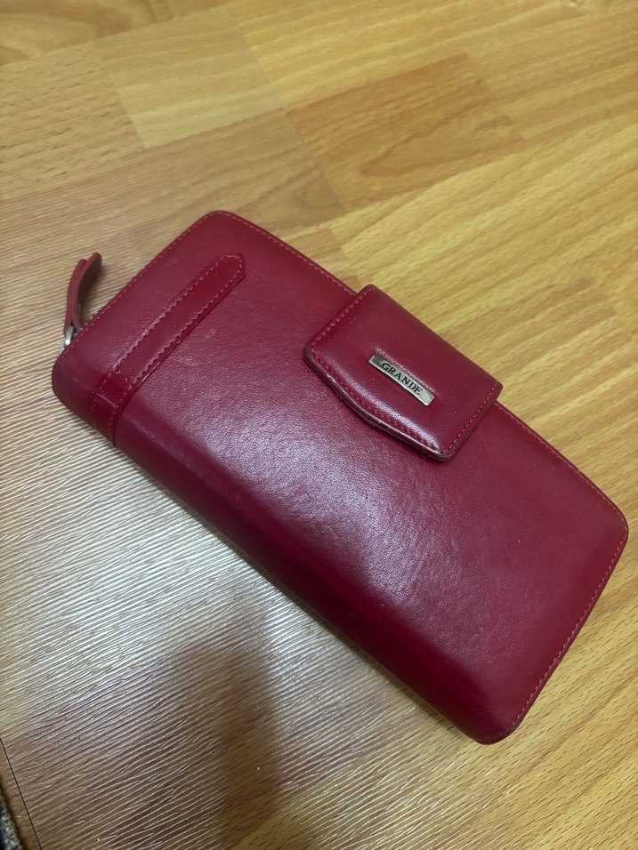 Hakiki deri kırmızı kadın cüzdanı, fermuarlı kapama ve modern klasik tasarıma sahiptir, günlük iş kullanımı için uygundur.