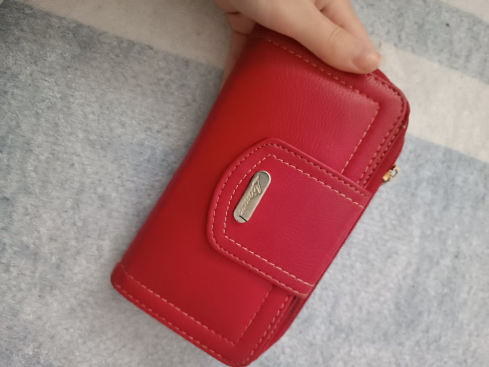 Kırmızı deri, fermuarlı kadın portföy cüzdan. Minimalist ve trend sokak stili, genç kadınlar için günlük kullanımda uygun.