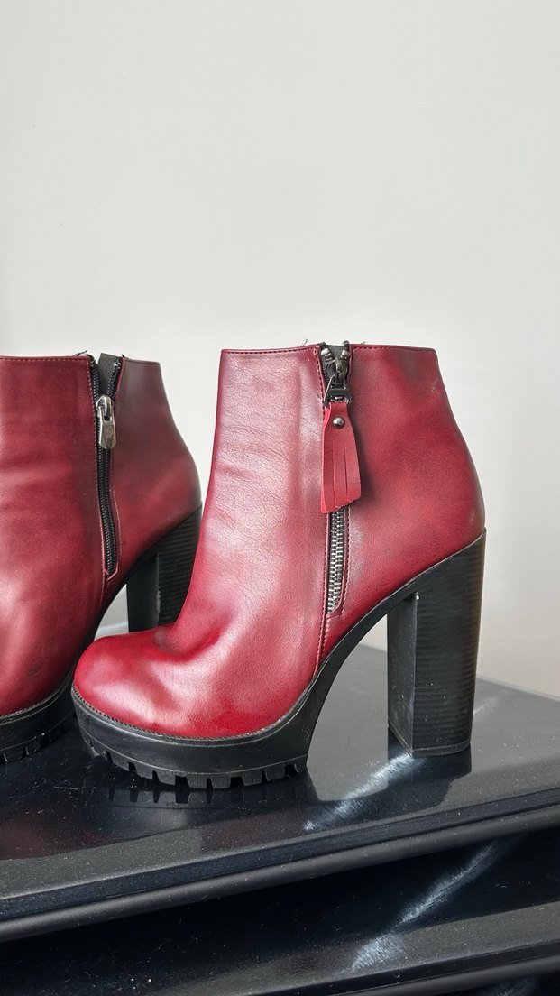 2 kere kullanıldı altından da görüldüğü gibi, bir sorunu yoktur. Topuk yüksekliği 11cm. Güneş vurduğunda parlak, normal ışıkta mat rengi. ‘Kutusuz’ gönderilecektir. Üzerinde siyah çizgiler olmuş pantolondan geçmiş olmalı. Silindiğinde çıkmıyor 2.fotoğrafa detaylı ekli
