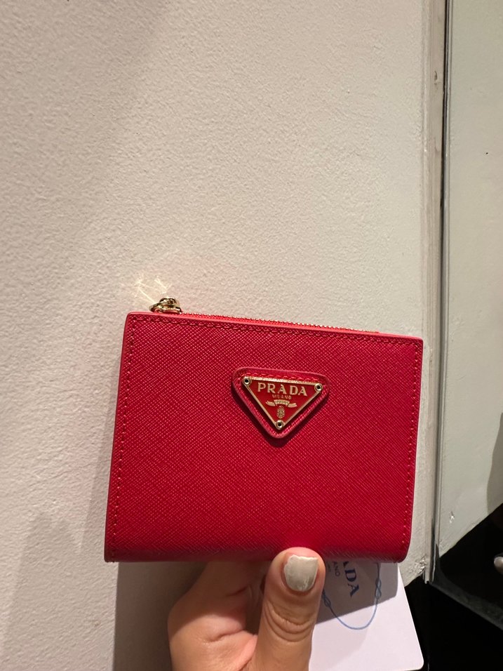 Kırmızı deri Prada cüzdan, fermuarlı kapanış ve baskılı desene sahip. Cesur sokak stilini Paris havasıyla günlük kullanıma sunar. Yurtdışıdan, tüm detaylar fotoğraflarda mevcut