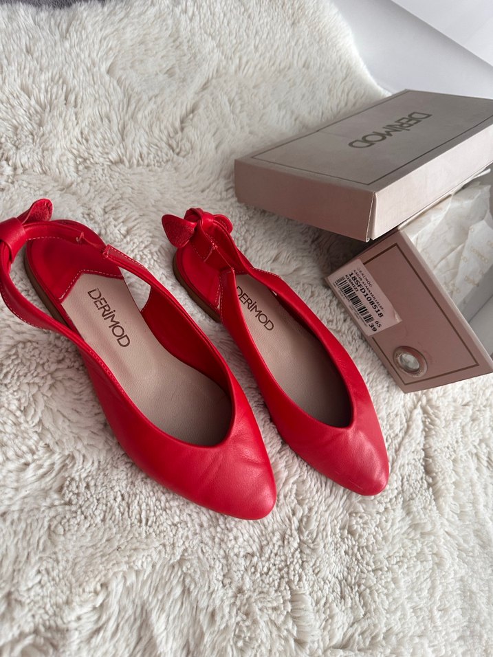DERIMOD markalı, süet görünümlü kırmızı deri blok topuklu kadın babet. Minimalist ve modern klasik tarzda, fiyonklu detayıyla romantik akşamlar için uygun.