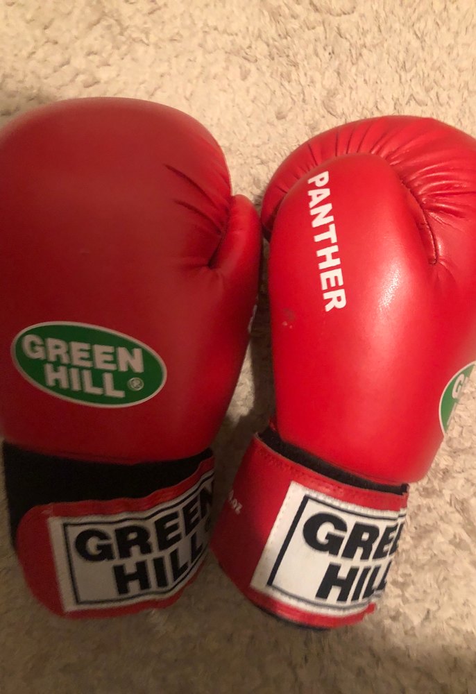Kırmızı deri Green Hill boks eldivenleri, Velcro bantlı, baskılı logo detaylıdır. Rahat oturur ve güvenli kapanır.