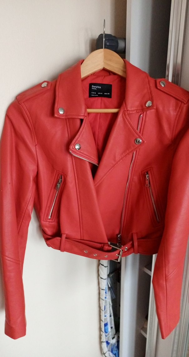 Kırmızı deri, fitted kesim biker ceket. Notch yaka, tokalı bel ve bantlı kolları vardır. Parlak yüzeyli, midi boyda, cesur Paris tarzı için uygun.
