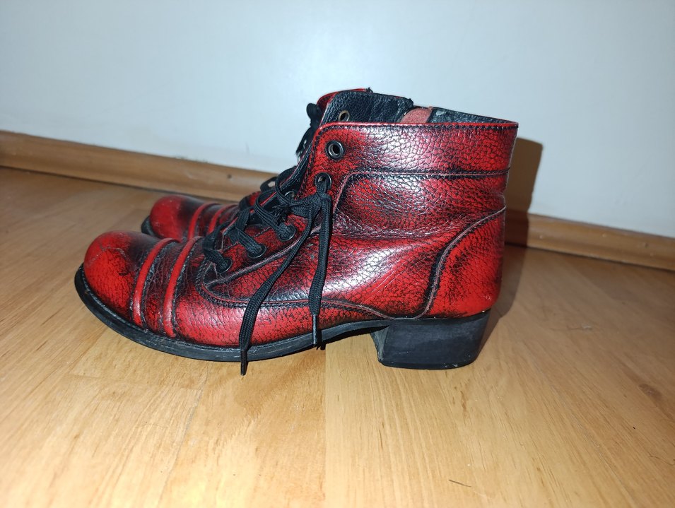 Koyu kırmızı deri kadın botları, blok topuklu ve tokalı detaylıdır. Bağcıklı ön kısmı ve eski tarz grunge punk görünümüyle günlük kullanıma uygundur.