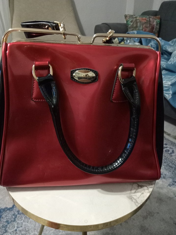 Parlak kırmızı deri kadın çanta, tokalı detaylı ve siyah saplı, günlük kullanım için modern klasik tarzda. ✨