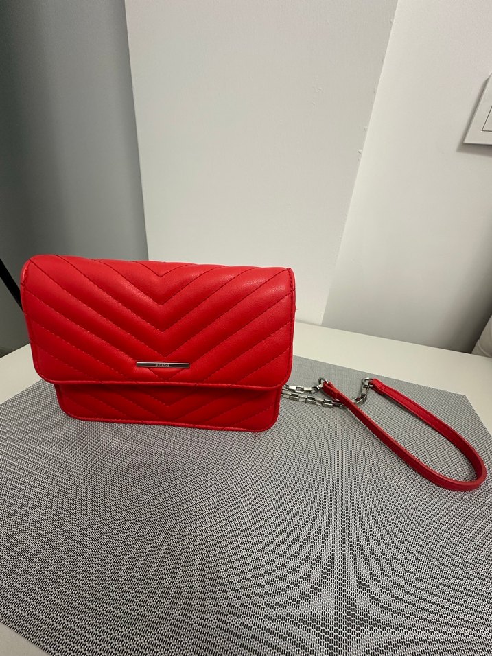 Kırmızı deri kadın çanta, kemerli tasarıma sahip, modern klasik stilde. Desensiz ve günlük kullanıma uygun, minimalist ve sade görünüm sunar.