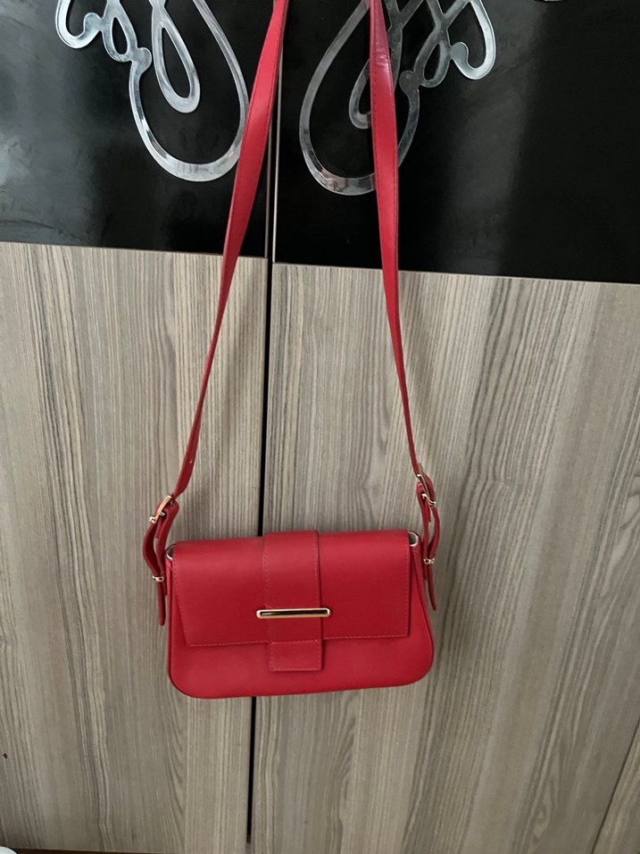 Kırmızı deri kadın çanta, tokalı tasarımı ve minimalist stiliyle günlük kullanım için cesur ve çağdaş bir görünüm sunar.