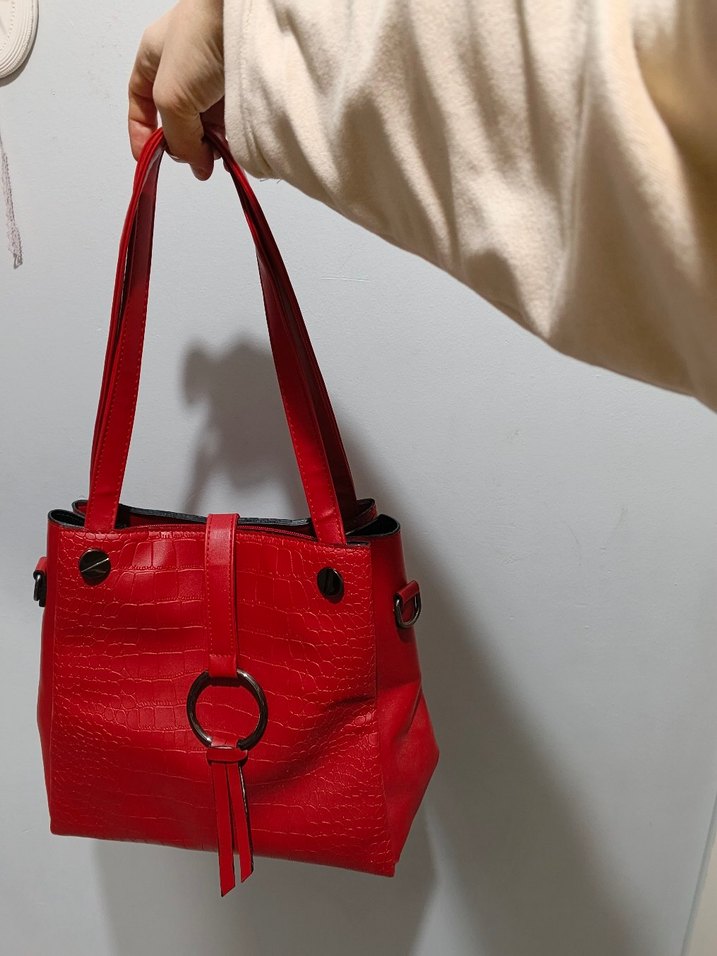 Parlak kırmızı deri kadın çanta, yılan deseni ve tokalı detaylı, trend sokak stiline uygun.