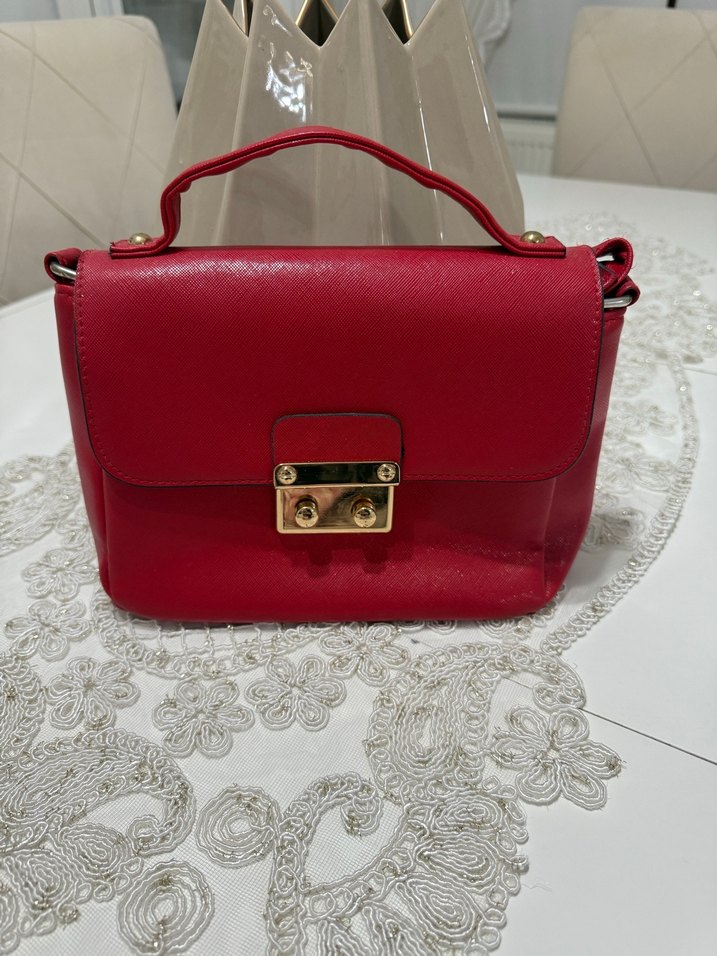 Kırmızı deri çanta, tokalı kapanış ve minimalist tasarımla modern klasik şıklığı günlük kullanım için sunuyor.