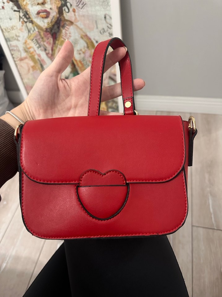 Kırmızı deri kadın çanta, kalp şeklinde tokası ve baskılı deseniyle cesur Paris sokak stiline uygun, romantik akşamlara ideal. ❤️