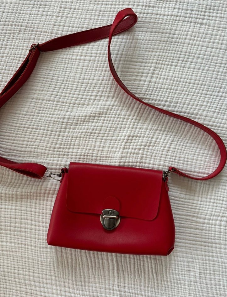 Kırmızı deri, tokalı ve ayarlanabilir askılı kadın çanta. Modern klasik tarzda, günlük kullanıma uygun.