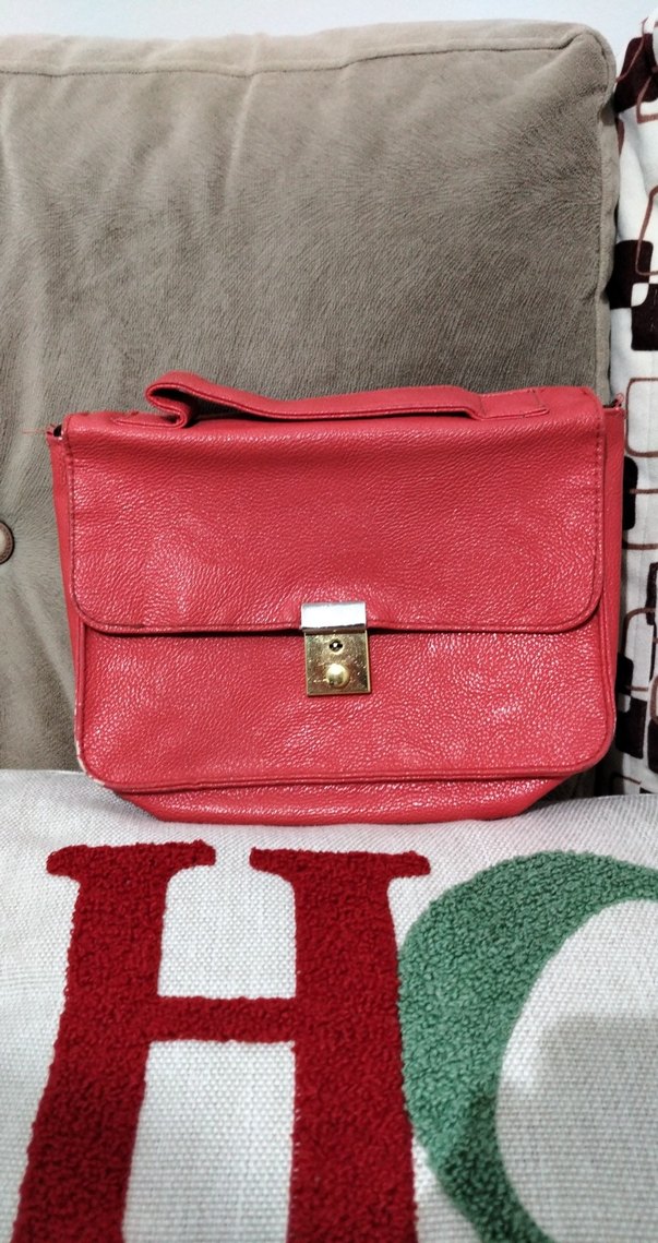 Kırmızı deri, tokalı kadın çanta, minimalist tasarımlı, günlük sokak modasına uygun. Ufak yıpranmaları var fotoğraflar da bulunuyor