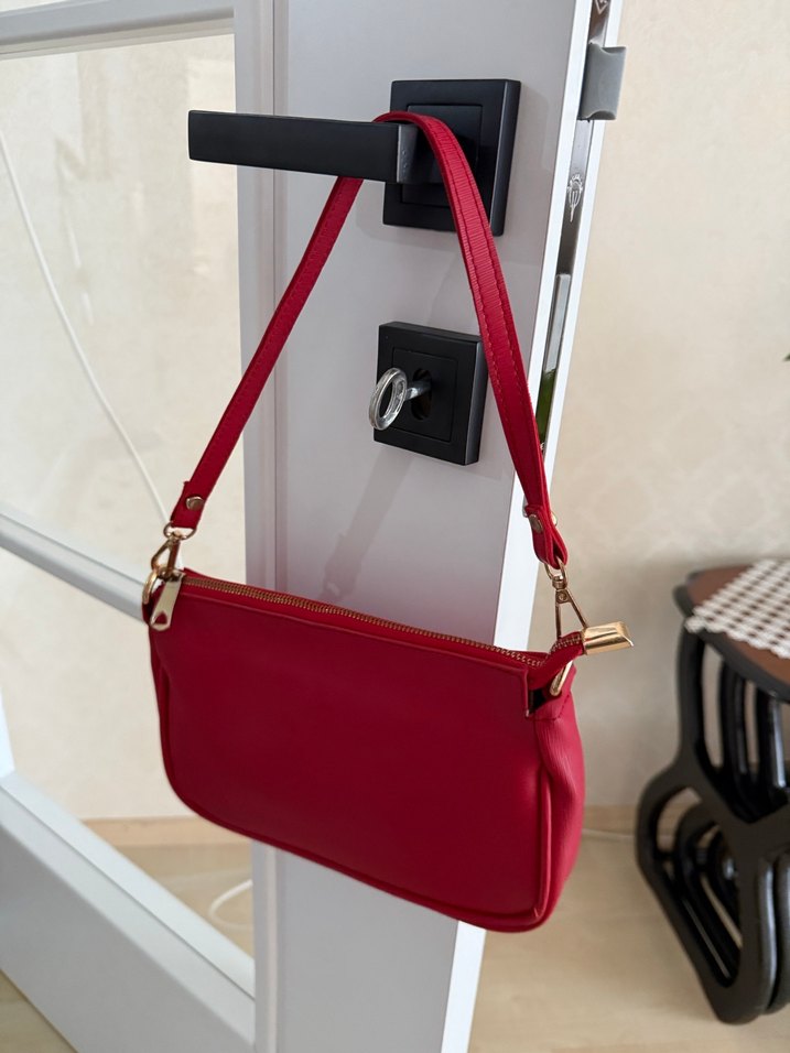 Parlak kırmızı deri kadın çanta, tokalı askısı ve modern klasik tasarımıyla günlük kullanıma uygun, hafif baskılı desene sahip.
