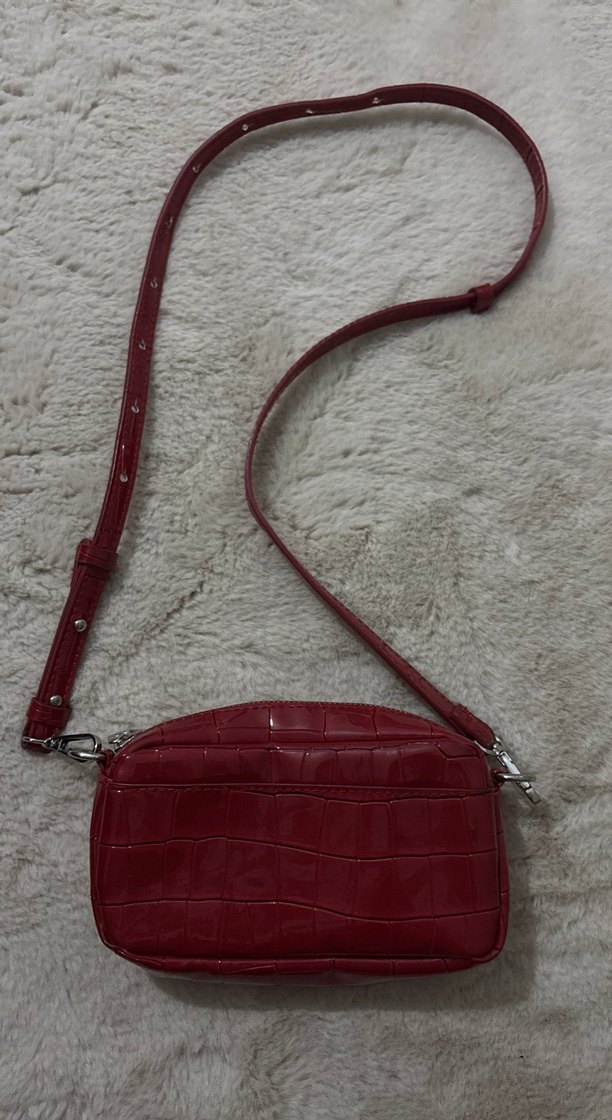 Kırmızı deri çapraz çanta, tokalı askı ve hafif yılan derisi desenine sahip, günlük sokak stiline uygun.