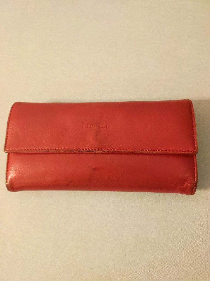 Kırmızı deri kadın cüzdanı, parlak yüzey ve tokalı kapama ile. Minimalist ve karşı kültür tarzına uygun sade, desensiz tasarım.