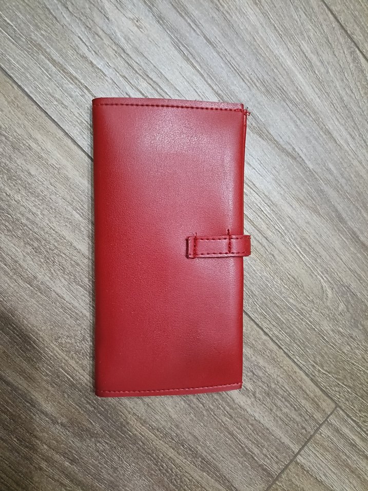 Parlak kırmızı deri kadın cüzdanı, vintage tarzda tokalı kapama ile sade ve desen içermeyen minimalist tasarıma sahiptir. Günlük kullanıma uygundur.