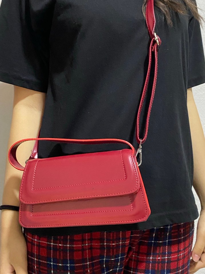 Kırmızı deri kadının omuz çantası, tokalı kapak ve ayarlanabilir askıyla sade ve günlük kullanıma uygun bir tasarıma sahip.