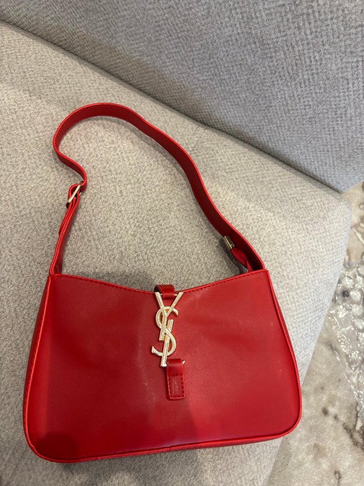 Kırmızı deri kadın omuz çantası, parlak yüzeyli ve tokalı kapamalıdır. Baskılı deseni ve trend sokak stiliyle uyumludur. Orijinal YSL çantadır.