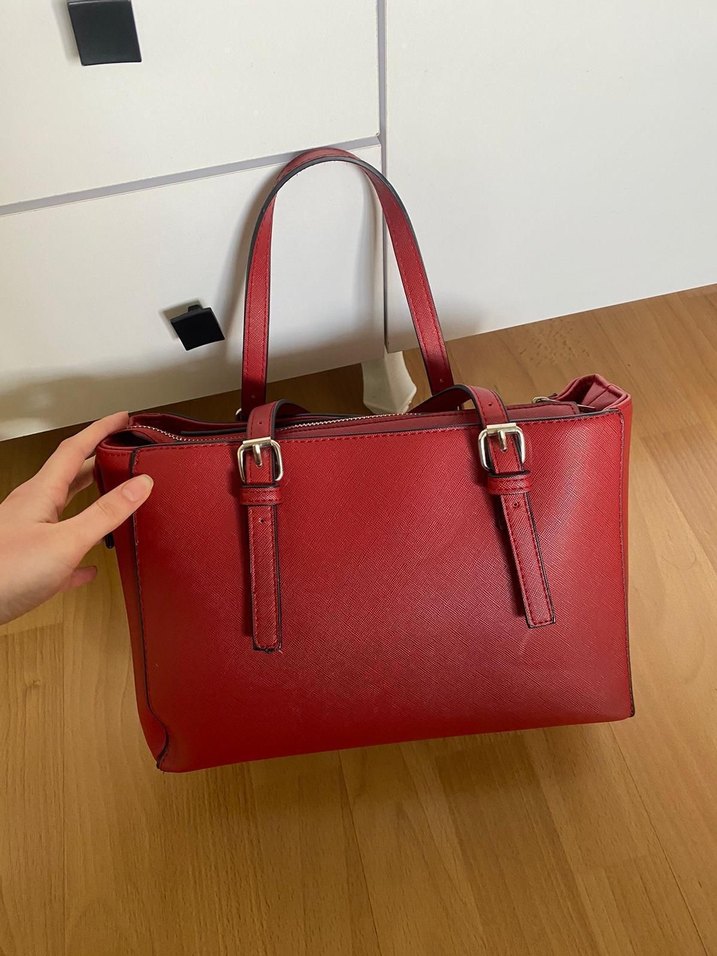 Parlak kırmızı deri omuz çantası, tokalı askılarla sade ve çağdaş tasarım, günlük kullanım için uygun. Desensiz ve düz stil.