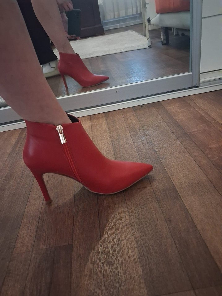 Kırmızı deri kadın bot, stiletto topuklu ve tokalı tasarımıyla ofis için cesur ve modern bir görünüm sunar. Desensiz ve canlı renktedir.