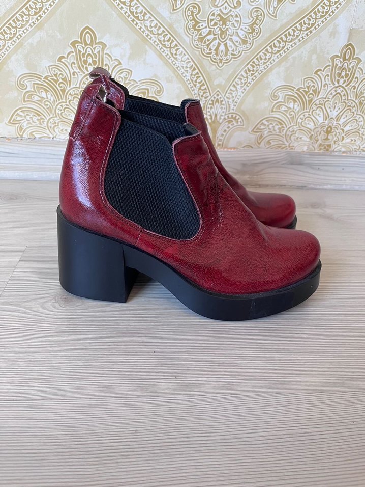 Parlak kırmızı deri, içi tüylü, kalın topuk ve lastik detaylara sahip kadın botları. Vintage tarzda, cesur ve karşı kültür görünümüyle günlük kullanım için uygun.