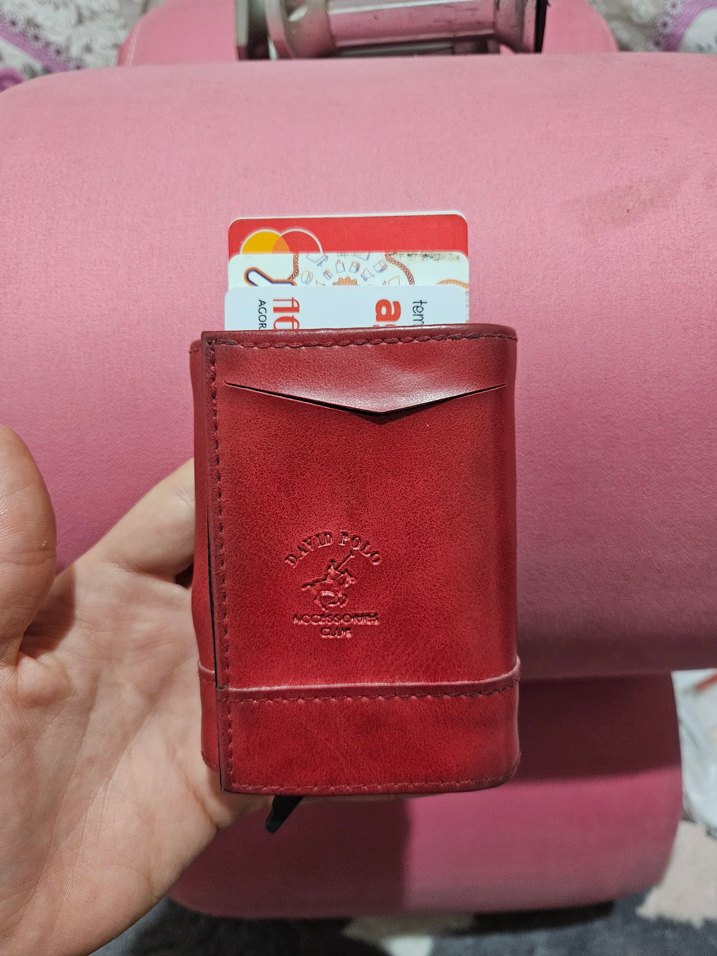 Kırmızı deri erkek cüzdanı, baskılı logo ve çoklu kart yuvalarına sahiptir, klasik tarz ile renkli dokunuşu birleştirir. unisex kartlık altındaki sistemi hafif gevşemiş ama kullanıma engel değil