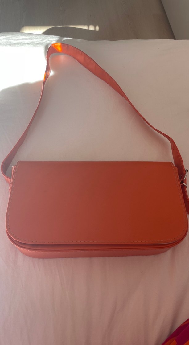 Parlak kırmızı deri, desen içermeyen minimalist tasarımlı kadın çanta. Günlük sokak stiline uygun, zahmetsiz şıklık sunar.